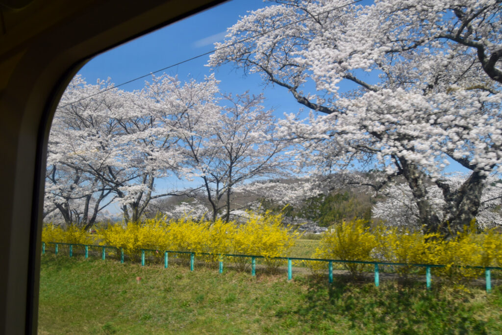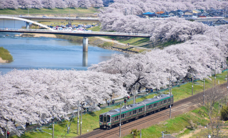 当日は仙台からJRで福島方面に向かい「大河原駅」で下車。電車の車窓からも桜並木を見る事ができます。