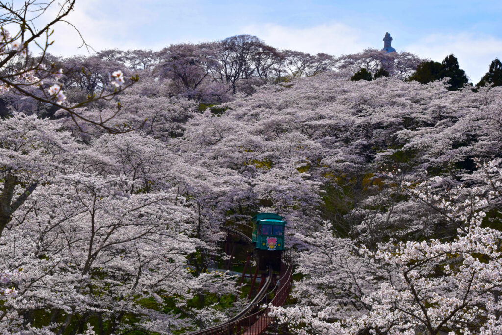 船岡城址公園は山全体に桜が咲いていて、山頂へは徒歩徒歩ルート以外にも桜のトンネルをくぐるケーブルカーで登る事もできます。
