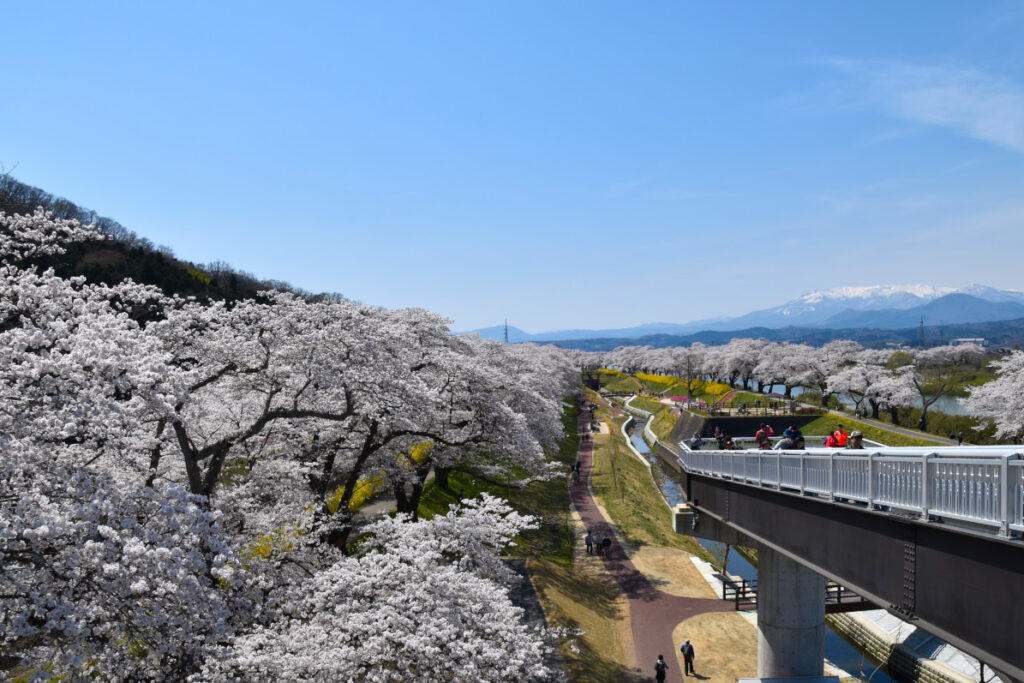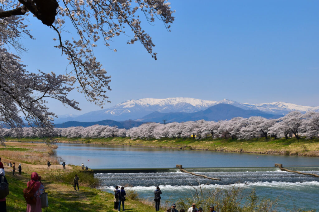 大河原駅を下車して川沿いに進むと、雪が残る蔵王連山を背景に桜が咲き連ねる贅沢な景色を見ながらの散策が楽しめます。